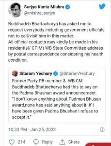 CPIM महासचिव सीताराम येचुरी ने ट्वीट करके जानकारी दी कि बुद्धदेव भट्टाचार्य का कहना है, ‘मुझे पद्म भूषण पुरस्कार के बारे में कुछ नहीं पता. मुझे इस बारे में किसी ने भी कुछ नहीं कहा है. अगर मुझे पद्म भूषण दिया गया है, तो मैं इसे स्वीकार करने से इनकार करता हूं.’