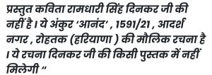 लेकिन वास्तव में यह उनकी रचना नहीं है। कई स्रोतों और टिप्पणियों से पता चलता है कि यह अंकुर ‘आनंद’ (रोहतक, हरियाणा) की मौलिक कविता है। दिनकर की किसी पुस्तक में यह नहीं मिलती। पूरी कविता कुछ इस प्रकार है: