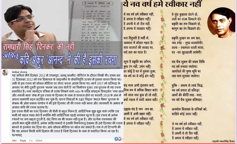 यह कविता मैंने दिसंबर 2012 में उधमपुर( जम्मू कश्मीर) पोस्टिंग के दौरान लिखी थी। प्रथम बार 31 दिसम्बर 2012 को एक हिमाचल के लाइनमैन के सेवानिवृत्ति उत्सव में इसका वाचन किया था। तभी से इस रचना को सोशल मीडिया पर पोस्ट करना आरंभ किया था। मार्च 2017 को प्रतिपदा के अवसर पर मेरी दूसरी पुस्तक ‘कलम जब ठान लेती है’ का विमोचन हुआ। उस पुस्तक में यह रचना प्रकाशित है। नया ज्ञानोदय पत्रिका में स्तंभ लिखने वाले ndtv के वरिष्ठ संपादक प्रियदर्शन ‘नया साल और नकली माल’ लेख में इस रचना के दिनकर के नाम से वायरल होने पर फरवरी 2018 के अंक में अपना वामपंथी रुदन प्रदर्शित कर चुके हैं। प्राच्य विद्याओं के उद्भट विद्वान ‘भारत वैभव’ पुस्तक के लेखक श्री ओम प्रकाश पाण्डेय ने भी इसे दिनकर जी की रचना नही माना और जानकारी के अभाव में अज्ञात कवि की रचना बताया है।