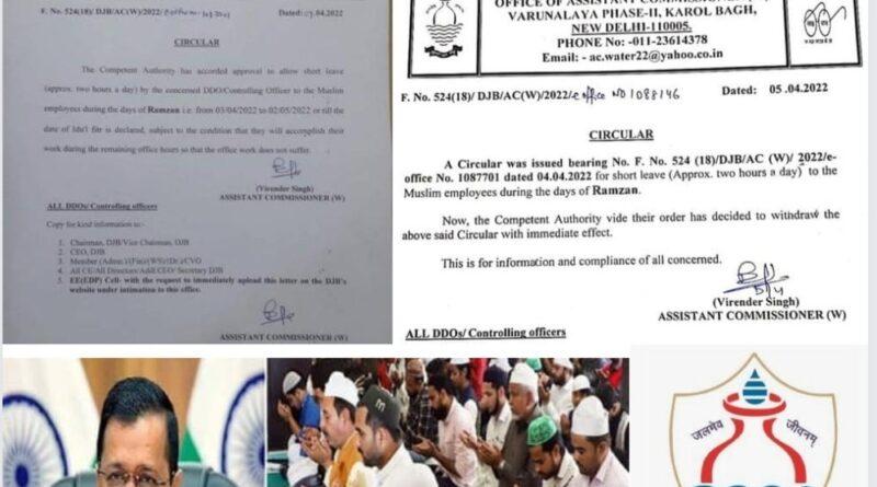 दिल्ली जल बोर्ड की ओर से सोमवार जारी एक आदेश में कहा गया था कि मुस्लिम कर्मचारी रमजान के दिनों में शॉर्ट लीव यानी 2 घंटे की छुट्टी ले सकेंगे। हालांकि एक दिन बाद इस सर्कुलर को वापस ले लिया गया।