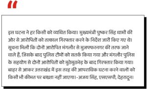 दून के मांडूवाला में भाजपा नेता रोहित नेगी की हत्या के मामले में आखिरकार जनाक्रोश काम आया। तीन दिन किरकिरी के बाद पुलिस पर जनदबाव इस कदर था कि पुलिस को उत्तराखंड की सीमा से बाहर जाकर उत्तर प्रदेश के सीमा क्षेत्र पुरकाजी में जाकर आरोपितों की घेराबंदी करनी पड़ी। मुख्य हत्यारोपित मुस्लिम है, लिहाजा स्वजन, स्थानीय जनता और जनप्रतिनिधियों से लेकर हिंदू संगठन भी पुलिस के विरुद्ध मोर्चा खोले हुए थे।