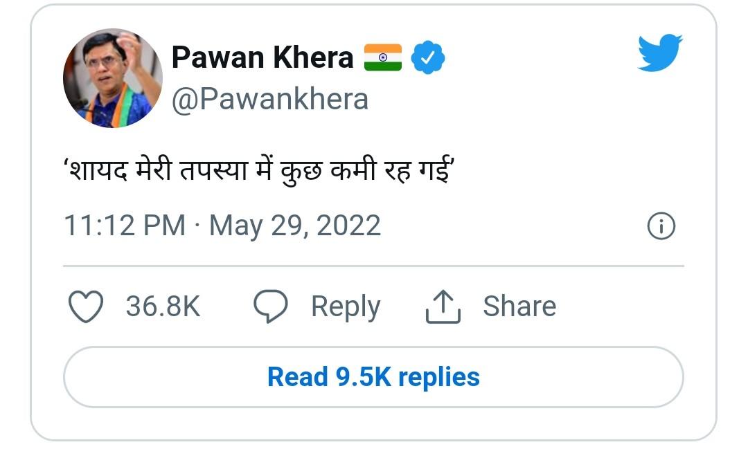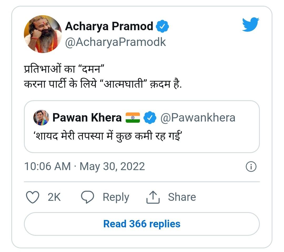 नई दिल्ली 30मई: कांग्रेस की लिस्ट देखकर कई नेताओं को अपनी तपस्या याद आ रही है। इसमें पवन खेड़ा, नगमा से लेकर आचार्य प्रमोद कृष्णम भी शामिल हैं। आचार्य प्रमोद ने खुलकर अपना असंतोष जाहिर किया है। नगमा के ’18 साल की तपस्या’ वाले ट्वीट पर उन्होंने लिखा, ‘सलमान ख़ुर्शीद, तारिक अनवर और आज़ाद साहब की तपस्या तो 40 साल की है, वो भी शहीद हो गए।’ वह यहीं तक नहीं रुके। आचार्य ने पवन खेड़ा के ट्वीट पर आगाह करते हुए कहा कि प्रतिभाओं का ‘दमन’ करना पार्टी के लिए ‘आत्मघाती’ क़दम है।