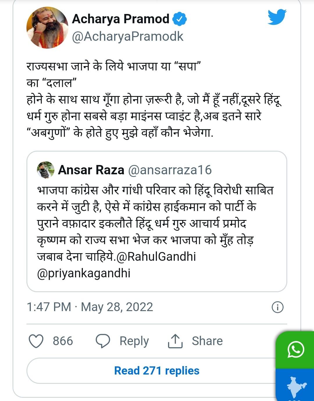 कुछ दिन पहले ही गरीब नवाज फाउंडेशन के चेयरमैन मौलाना अंसार रजा ने कांग्रेस आलाकमान से मांग की थी कि आचार्य प्रमोद कृष्णम को राज्यसभा भेजा जाए। उस समय भी आचार्य प्रमोद ने भावुक अंदाज में लिखा था, ‘राज्यसभा जाने के लिए भाजपा या ‘सपा’ का ‘दलाल’ होने के साथ साथ गूंगा होना ज़रूरी है, जो मैं हूं नहीं, दूसरे हिंदू धर्म गुरु होना सबसे बड़ा माइनस प्वाइंट है, अब इतने सारे ‘अवगुणों’ के होते हुए मुझे वहां कौन भेजेगा।’