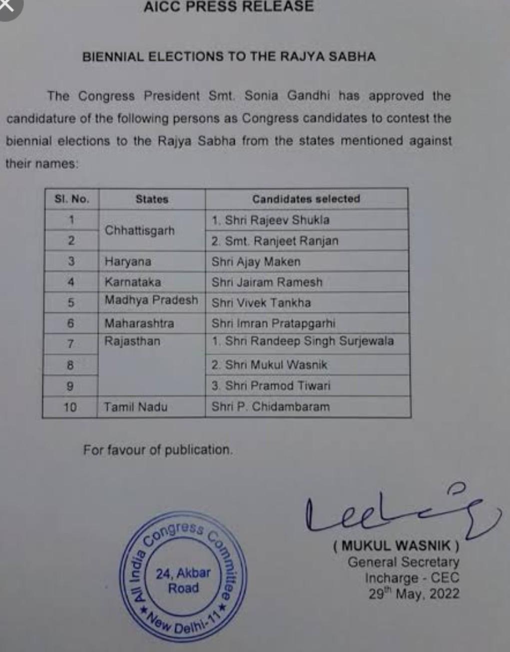 1-कांग्रेस ने राज्यसभा के लिए 10 उम्मीदवारों की लिस्ट जारी की