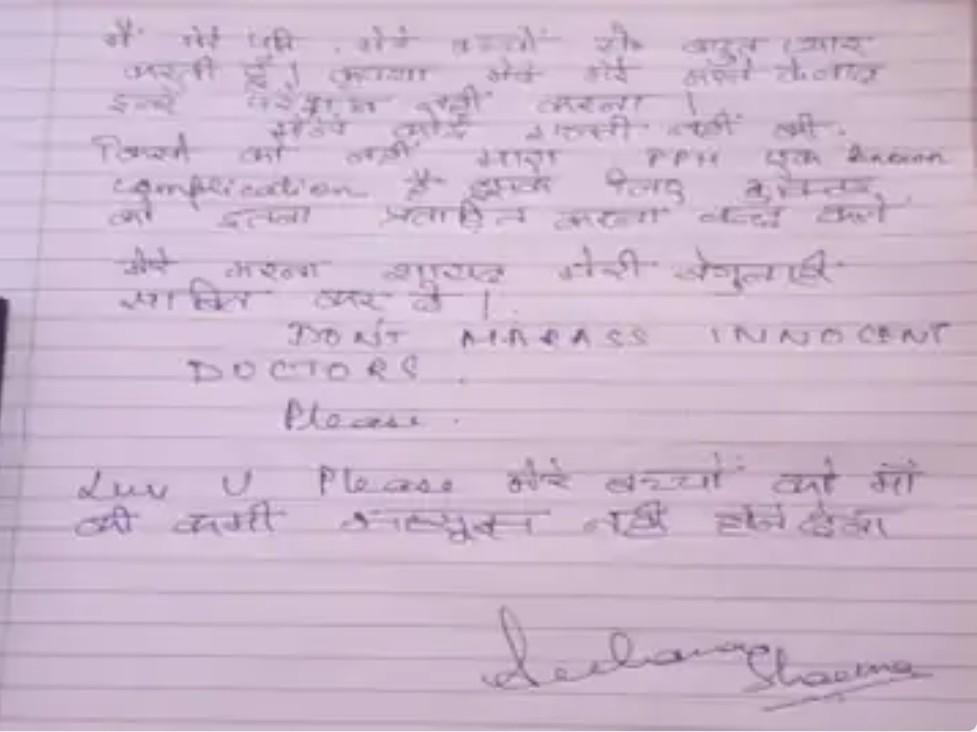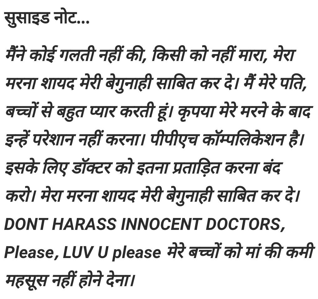 मैंने कोई गलती नहीं की, किसी को नहीं मारा, मेरा मरना शायद मेरी बेगुनाही साबित कर दे। मैं मेरे पति, बच्चों से बहुत प्यार करती हूं। कृपया मेरे मरने के बाद इन्हें परेशान नहीं करना। पीपीएच कॉम्पलिकेशन है। इसके लिए डॉक्टर को इतना प्रताड़ित करना बंद करो। मेरा मरना शायद मेरी बेगुनाही साबित कर दे। DONT HARASS INNOCENT DOCTORS, Please, LUV U please मेरे बच्चों को मां की कमी महसूस नहीं होने देना।