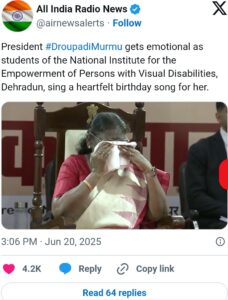 देहरादून के राष्ट्रीय दृष्टि दिव्यांगजन सशक्तीकरण संस्थान (एनआईईपीवीडी) पहुंचीं राष्ट्रपति द्रौपदी मुर्मू अपने जन्मदिन पर दृष्टिबाधित बच्चों की सुरीली प्रस्तुति देखकर भावुक हो गईं। बच्चों ने जब गाया कि तुम जियो हजारों साल.. हैप्पी बर्थ डे टू यू तो यह सुनकर उनके आंसू छलक पड़े।