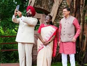 राष्ट्रपति निकेतन में द्रोपदी मुर्मू के साथ मुख्यमंत्री पुष्कर सिंह धामी और राज्यपाल लेफ्टिनेंट जनरल (सेवानिवृत्त) गुरमीत सिंह