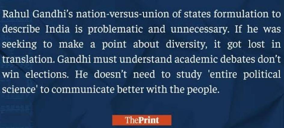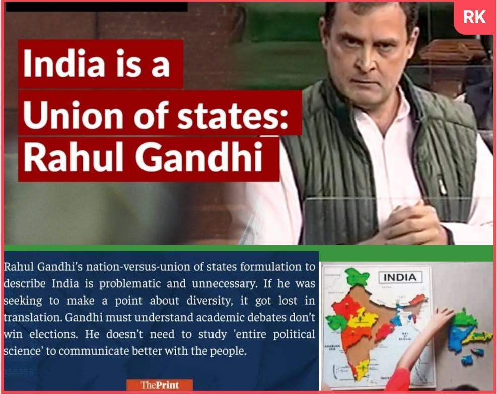 विदेशी भूमि पर भारत को एक राष्ट्र की बजाय राज्यों का संघ बताने वाले राहुल गांधी के नेतृत्व में कांग्रेस पार्टी केंद्र की भाजपा सरकार के खिलाफ कांग्रेस भारत जोड़ो यात्रा के रूप में एक राष्ट्रव्यापी यात्रा निकाल रही है
