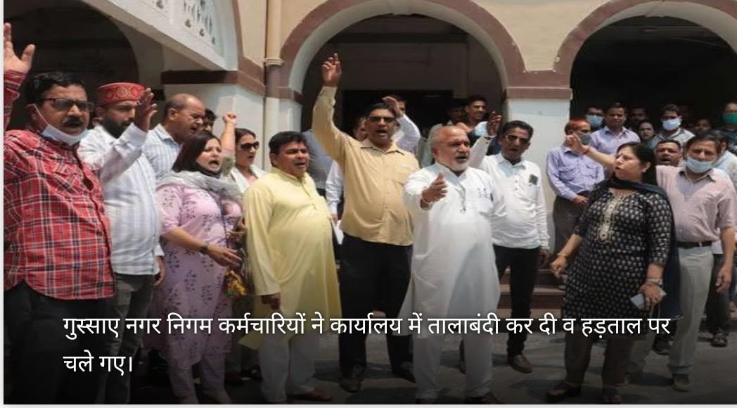 गुस्साए नगर निगम कर्मचारियों ने कार्यालय में तालाबंदी कर दी व हड़ताल पर चले गए।