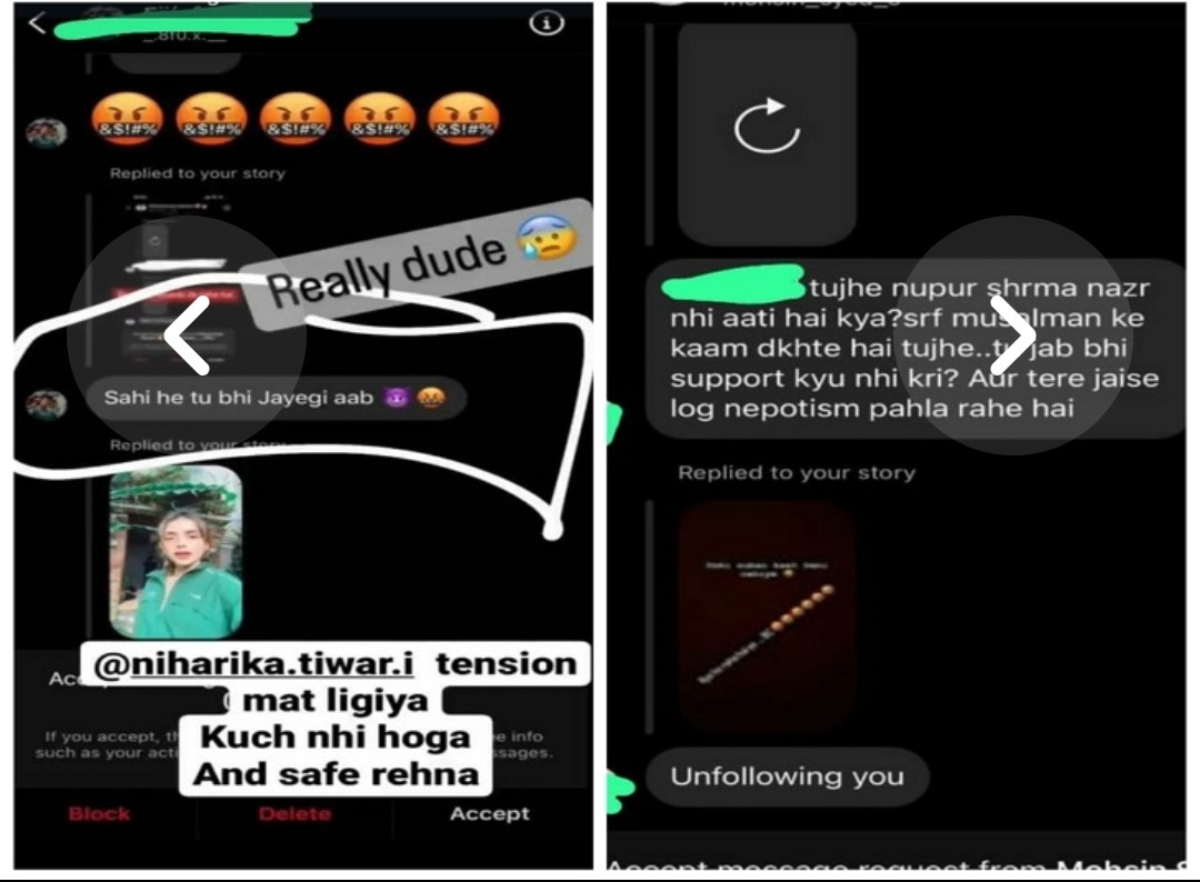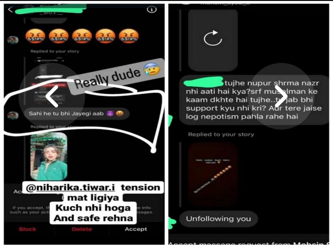 इंस्टाग्राम में निहारिका को अलग-अलग ID से धमकियां मिली हैं। कुछ यूजर्स ने कहा कि, तेरा गला भी ऐसे ही कटेगा, तू रुक। एक यूजर ने कहा कि, गिनती चालू कर ले। जो तेरा काम है उसी पर ध्यान दे।