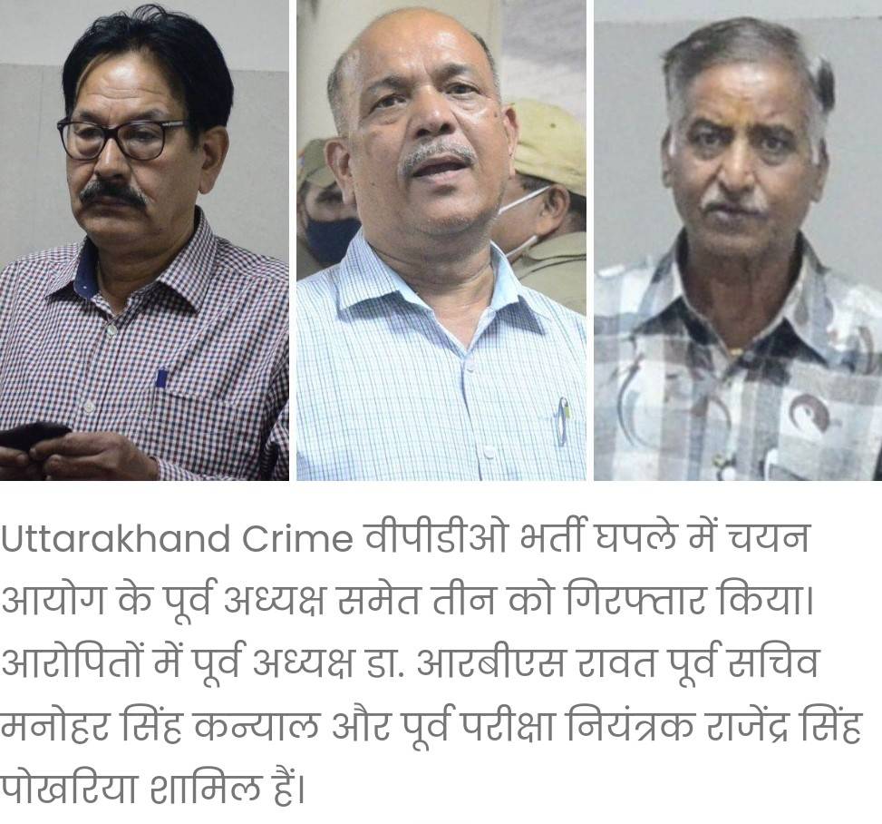 Uttarakhand Crime वीपीडीओ भर्ती घपले में चयन आयोग के पूर्व अध्यक्ष समेत तीन को गिरफ्तार किया। आरोपितों में पूर्व अध्यक्ष डाक्टर आरबीएस रावत पूर्व सचिव मनोहर सिंह कन्याल और पूर्व परीक्षा नियंत्रक राजेंद्र सिंह पोखरिया शामिल हैं।
