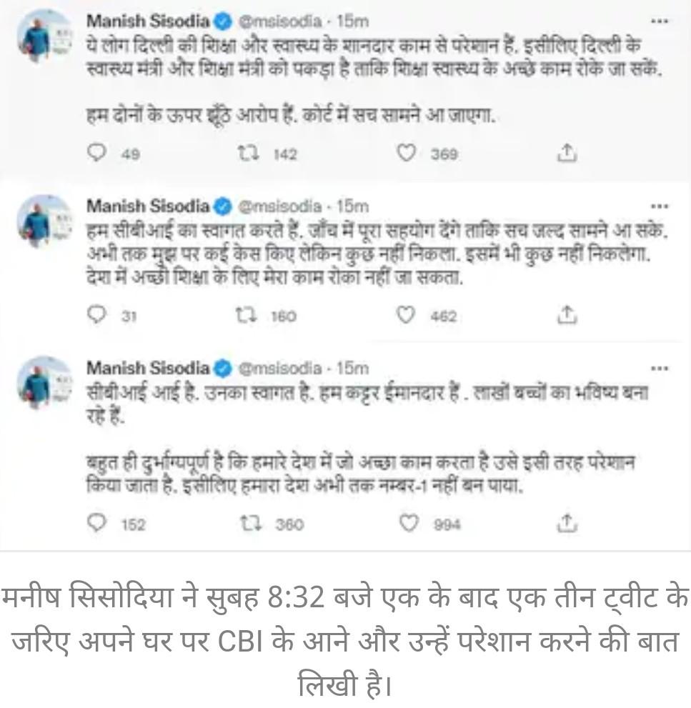 मनीष सिसोदिया ने सुबह 8:32 बजे एक के बाद एक तीन ट्वीट के जरिए अपने घर पर सीबीआई आने और परेशान करने की बात लिखी है।