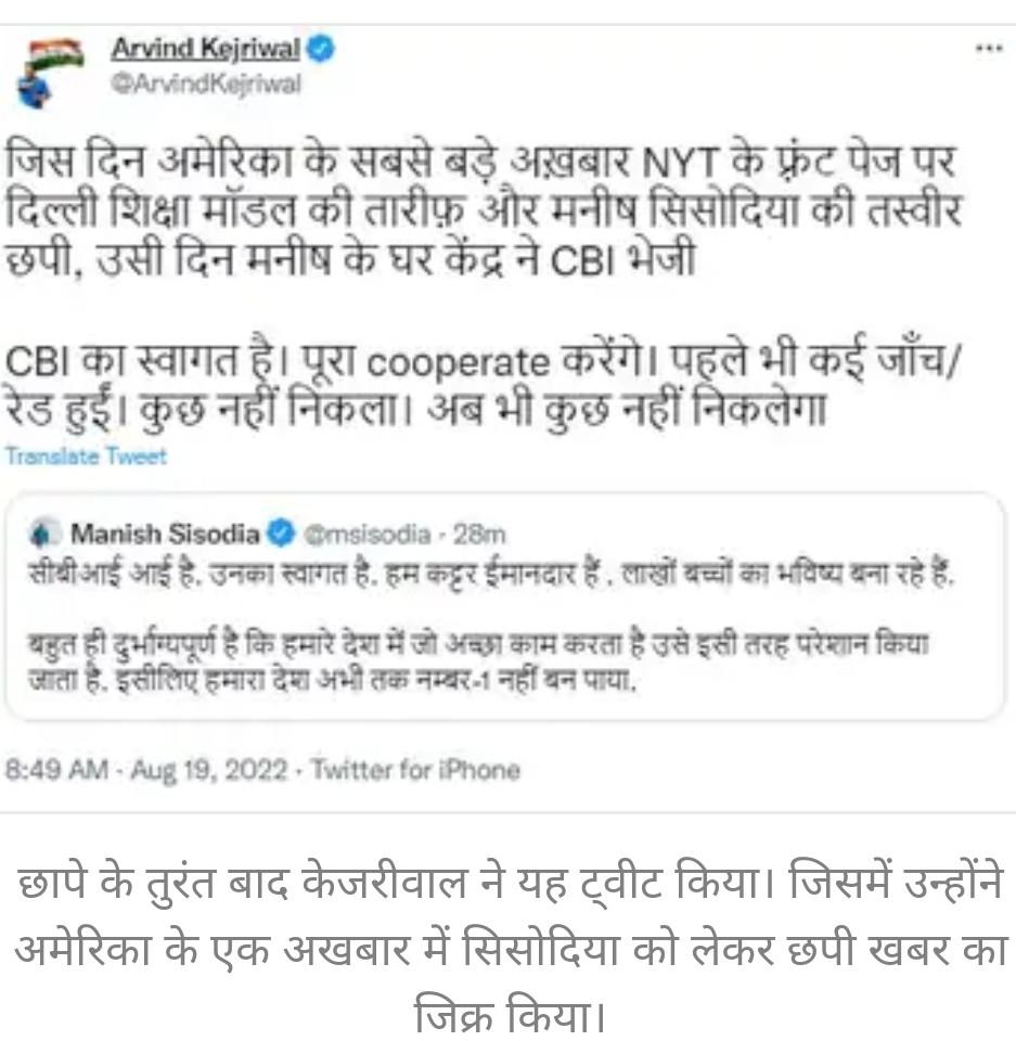 छापे के तुरंत बाद केजरीवाल ने यह ट्वीट किया जिसमें उन्होंने अमेरिका के एक अखबार में सिसोदिया को लेकर छपी खबर का जिक्र किया।