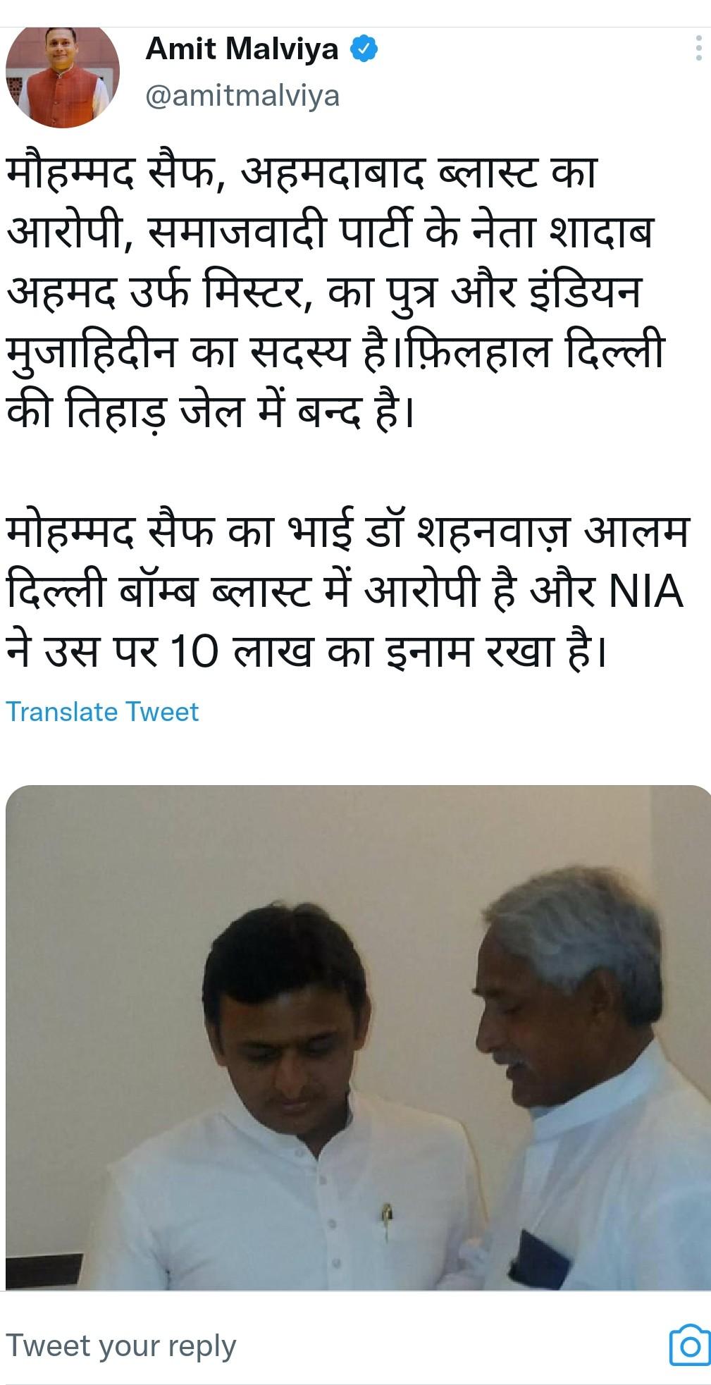 भारतीय जनता पार्टी (भाजपा) ने सपा के खिलाफ मोर्चा खोल दिया है. भाजपा का आरोप है कि कोर्ट में भी ये कहा गया है कि आरोपित के पिता का सपा अध्यक्ष के साथ लिंक है. लखीमपुरी खीरी पहुंचे अखिलेश यादव ने इन आरोप को लेकर कहा कि यदि कोई झूठ बोल फैला रहा है तो वो भाजपा है. भाजपा नेता अमित मालवीय ने एक तस्वीर ट्वीट करते हुए लिखा है कि अहमदाबाद ब्लास्ट का आरोपित मोहम्मद सैफ समाजवादी पार्टी के नेता शादाब अहमद उर्फ मिस्टर का पुत्र और इंडियन मुजाहिदीन का सदस्य है. फिलहाल दिल्ली की तिहाड़ जेल में बंद है. मोहम्मद सैफ का भाई डॉक्टर शहनवाज आलम दिल्ली बम ब्लास्ट में आरोपित है और NIA ने उस पर 10 लाख का इनाम रखा है.