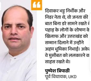 यूकेडी के पूर्व अध्यक्ष और द्वाराहाट के पूर्व विधायक पुष्पेश त्रिपाठी ने दिवाकर भट्ट के निधन पर गहरा शोक व्यक्त किया। उन्होंने कहा कि दिवाकर भट्ट का योगदान उत्तराखंड आंदोलन और क्षेत्रीय राजनीति में अत्यंत महत्वपूर्ण रहा है।