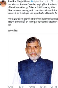” राज्य निर्माण आंदोलन से लेकर जनसेवा के क्षेत्र में उनके द्वारा किए गए कार्य सदैव अविस्मरणीय हैं। ईश्वर से प्रार्थना है कि पुण्यात्मा को श्रीचरणों में स्थान दे।