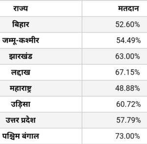 उत्तर प्रदेश में आज मोहनलालगंज,लखनऊ,अमेठी, राय बरेली,जालौन,झांसी,हमीरपुर,बांदा,फतेहपुर,कौशांबी,बाराबंकी,फैजाबाद,कैसरगंज,गोंडा,महाराष्ट्र में धुले,डिंडोरी,नासिक, कल्याण,पालघर,भिवंडी,ठाणे,मुंबई उत्तर,मुंबई उत्तर-पश्चिम, मुंबई उत्तर-पूर्व,मुंबई उत्तर-मध्य, मुंबई दक्षिण-मध्य,मुंबई दक्षिण,बिहार में सीतामड़ी,मधुबनी,मुजफ्फरपुर,सारण,हाजी पुर,ओडिशा में बरगढ़,सुंदरगढ़,बोलांगीर,कंधमाल,अस्का, पश्चिम बंगाल के बनगांव,बैरकपुर,हावड़ा,उलुबेरिया ,रामपुर, हुगली,आरामबाग,झारखंड में चतरा, कोडरमा, हजारीबाग और जम्मू-कश्मीर की बारामूला और लद्दाख में वोट डाले गए।