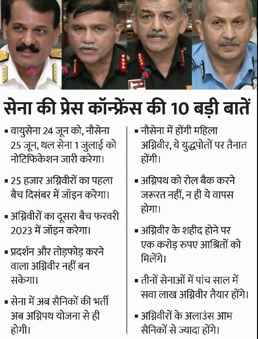 सेना प्रमुख जनरल मनोज पांडे ने कहा कि अग्निपथ योजना का उद्देश्य सशस्त्र बलों में भर्ती में आमूल-चूल परिवर्तन लाना है। वहीं नौसेना प्रमुख एडमिरल आर. हरि कुमार ने जानकारी दी कि अग्निपथ योजना के तहत महिलाओं को भी सशस्त्र सेनाओं में शामिल किया जाएगा।