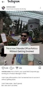 ऑफिस पॉलिटिक्स पर टिप्स देने वाले इस शख्स का नाम रोहित यादव है। रोहित ने बताया है कि वो एक टेक कंपनी में प्रॉडक्ट मैनेजर के पद पर काम करते हैं। रोहत अक्सर वर्कप्लेस और कॉर्पोरेट जॉब से जुड़े टिप्स शेयर करते रहते हैं। उसी कड़ी में करीब एक हफ्ते पहले उन्होंने इंस्टाग्राम पर एक पोस्ट शेयर की। इस पोस्ट में उन्होंने बताया है कि वो कैसे ऑफिस पॉलिटिक्स में शामिल हुए बिना इससे बचते रहे हैं।