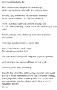 अंत में रोहित लिखते हैं ‘ऑफिस में होने वाली राजनीति से खुद को बचाने के लिए आपको उसका हिस्सा बनने की जरूरत नहीं है। बस स्मार्ट बनिए, शांत रहिए और अपने काम पर फोकस रखिए।’