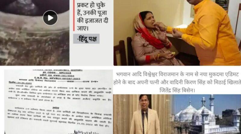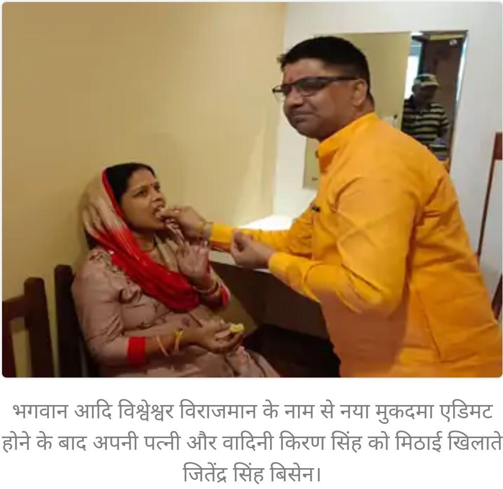 भगवान आदि विश्वेश्वर विराजमान के नाम से नया मुकदमा एडिमट होने के बाद अपनी पत्नी और वादिनी किरण सिंह को मिठाई खिलाते जितेंद्र सिंह बिसेन।