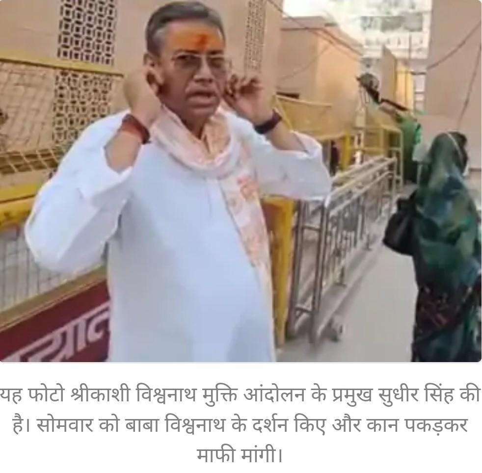 श्रीकाशी विश्वनाथ मुक्ति आंदोलन के प्रमुख सुधीर सिंह ने सोमवार को बाबा विश्वनाथ के दर्शन किए। इसके बाद कान पकड़ कर आदि विश्वेश्वर से माफी मांगी। सुधीर सिंह ने श्रीकाशी विश्वनाथ धाम के बाहर खड़े होकर कान पकड़ कर माफी मांगी है। उन्होंने कहा कि ज्ञानवापी में मिले स्वयंभू शिवलिंग की 300 से ज्यादा वर्षों से पूजा नहीं हो पाई है। इसके लिए हम काशीवासी कान पकड़ कर माफी मांगते हैं। भोलेनाथ दयालु हैं, वह हम सबको माफ कर देंगें।