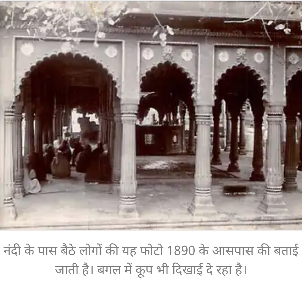 नंदी के पास बैठे लोगों की यह फोटो 1890 के आसपास की बताई जाती है। बगल में कूप भी दिखाई दे रहा है।