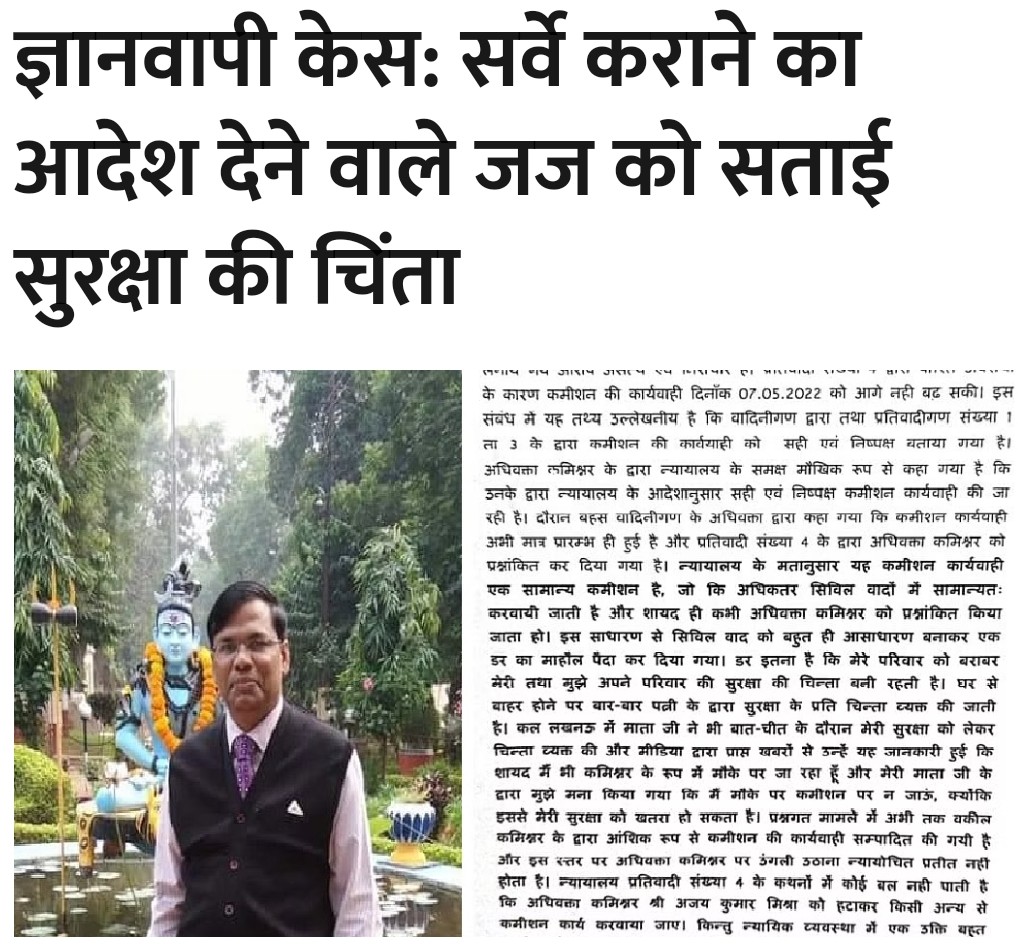 दिवाकर ने लिखा- घर से बाहर होने पर बार-बार पत्नी मेरी सुरक्षा के लिए चिंतित रहती है। 11 मई को मां ने मेरी सुरक्षा को लेकर चिंता जाहिर की। शायद उन्हें पता चला था कि मैं कमिश्नर के रुप में ज्ञानवापी जा रहा हूं। मुझे मां ने मना भी किया कि मैं कमीशन में न जाऊं, क्योंकि वहां मेरी सुरक्षा को खतरा हो सकता है।