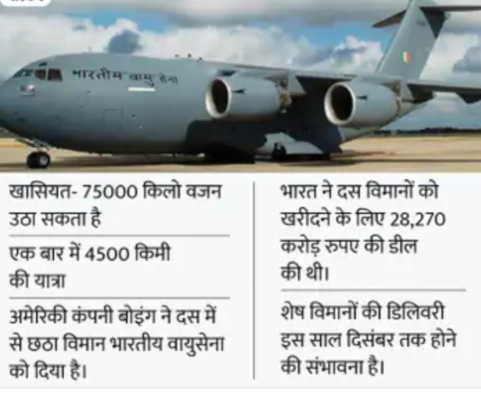 C-17 ग्लोबमास्टर ने अफगानिस्तान में अशांति के दौरान 640 लोगों को लेकर उड़ान भरी थी। भारतीय वायुसेना ने C-17 ग्लोबमास्टर विमान से भारतीयों को काबुल से दो बार एयरलिफ्ट किया था। भारत के पास 11 C-17 ग्लोबमास्टर विमान हैं। इस विमान का बाहरी ढांचा इतना मजबूत है कि इस पर राइफल और छोटे हथियारों की फायरिंग का कोई असर नहीं होता है।
