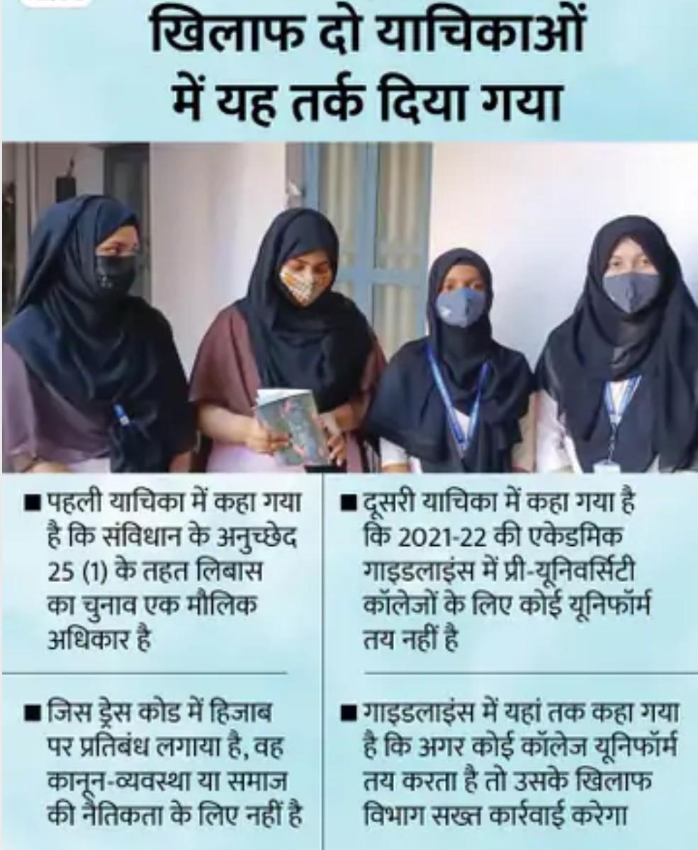 इसके बाद इन लड़कियों ने कर्नाटक हाईकोर्ट में एक याचिका दायर की थी। लड़कियों का तर्क है कि हिजाब पहनने की इजाजत न देना संविधान के आर्टिकल 14 और 25 में उनके मौलिक अधिकार का हनन है।