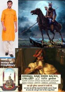 आज जिसे पठानी सूट कहा जाता है वह दरअसल महिलाओं की सलवार-कमीज है। कहा जाता है कि एक बार एक बुर्जुग सरदार ने अपने भाषण में कहा था, ”हमारे पूर्वज हरि सिंह नलवा ने पठानों को सलवार पहना दी थी। आज भी सिखों के डर से पठान सलवार पहनते हैं.” हरि सिंह नलवा की लीडरशिप में महाराजा रणजीत सिंह की सेना 1820 में फ्रंटियर में आयी थी। तब नलवा की फौज ने बहुत आसानी से पठानों पर जीत हासिल कर ली थी। लिखित इतिहास में यही एक ऐसा वक्त है, जब पठान महाराजा रणजीत सिंह के शासन के गुलाम हो गए थे। उस वक्त जिसने भी सिखों का विरोध किया उनको बेरहमी से कुचल दिया गया। तब ये बात बहुत प्रचलित हो गई थी कि सिख तीन लोगों की जान नहीं लेते हैं… पहला स्त्रियां… दूसरा बच्चे और तीसरा बुजुर्ग। बस क्या था, तभी से पठान पंजाबी महिलाओं का पहनावा सलवार कमीज पहनने लगे। यानि एक ऐसा वक्त आया जब महिलाएं और पुरुष एक जैसे ही कपड़े पहनने लगे।
