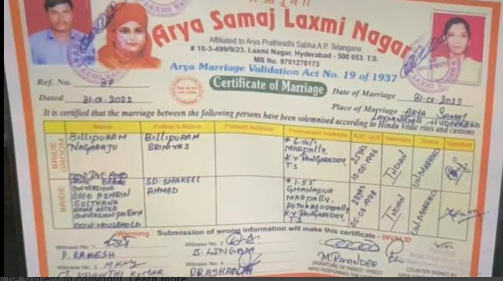 नागराजू और सुल्ताना ने जनवरी में आर्य समाज मंदिर में जाकर शादी कर ली थी।