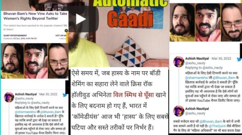 पहाड़ी पांडा चैनल के आशीष नौटियाल ने इस क्लिप को साझा करते हुए महिला आयोग अध्यक्ष रेखा शर्मा से सवाल किया है कि क्या वो इस तरह महिला विरोधी टिप्पणी करने वाले भुवन बाम के ख़िलाफ़ कार्रवाई के निर्देश दे सकती हैं। उनकी माँग है कि ऐसे लोगों को युवाओं तक पहुँचने से रोका जाए और संभव हो तो चैनल भी डिलीट हो।
