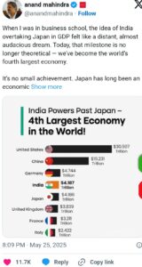 आनंद महिंद्रा ने सोशल मीडिया प्लेटफॉर्म ‘एक्स’ पर अपनी प्रतिक्रिया व्यक्त की। उन्होंने कहा, ‘जब मैं बिजनेस स्कूल में था तो भारत को GDP में जापान से आगे निकलने का विचार एक दूर का, लगभग दुस्साहसी सपना लगता था।’ उन्होंने आगे कहा, ‘आज वह मील का पत्थर अब सैद्धांतिक नहीं है – हम दुनिया की चौथी सबसे बड़ी अर्थव्यवस्था बन गए हैं।’