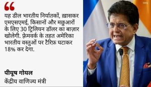 इससे पहले पीयूष गोयल ने बताया था कि भारत-अमेरिका व्यापार सौदे में डेयरी उत्पाद, फल, सब्जियां, मसाले और अनाज जैसी चीजें शामिल हैं। इन सभी को इस तरह से सुरक्षित किया गया है कि हमारे देश के किसानों को कोई नुकसान न हो। उन्होंने एक्स पर लिखा कि यह समझौता भारत को आत्मनिर्भर बनाने की दिशा में एक बहुत बड़ा कदम है। उन्होंने कहा कि इस डील में किसानों की भलाई का ध्यान रखा गया है और इससे देश का विकास होगा।