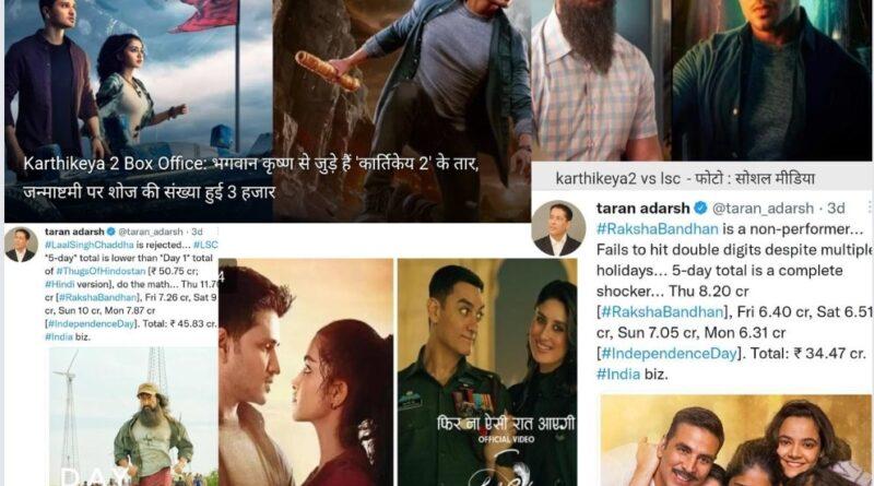 बॉक्स ऑफिस पर साल की शुरुआत से फिल्मों की जबरदस्त भिड़ंत देखने को मिल रही है। एक ओर जहां साउथ की छोटे बजट की फिल्में कमाल कर रही हैं, तो दूसरी ओर बॉलीवुड की फिल्मों को बॉक्स ऑफिस पर मुंह की खानी पड़ रही है। आमिर खान की ‘लाल सिंह चड्ढा’ और अक्षय कुमार की ‘रक्षा बंधन’ का बॉक्स ऑफिस पर प्रदर्शन बेहद निराशाजनक है, जो दिन-ब-दिन गिरता जा रहा है। इसके अलावा निखिल सिद्धार्थ की तेलुगू फिल्म ‘कार्तिकेय 2’ अपनी बढ़त बनाए हुए है। इसी बीच तापसी पन्नू की फिल्म ‘दोबारा’ ने भी सिनेमाघरों में दस्तक दे दी है। तो चलिए देखते हैं कि गुरुवार को किस फिल्म ने बॉक्स ऑफिस पर बाजी मारी और कौन धराशायी हो गई।