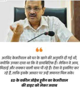 कोर्ट में सुनवाई में ईडी ने बताया कि केजरीवाल टाइप-2 डाइबिटिक है लेकिन वह जेल में जानबूझकर आलू पूड़ी,आम और मीठा खा रहे हैं.
