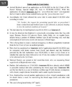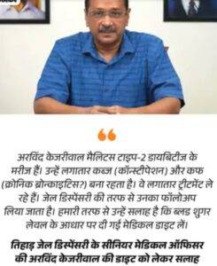 अब बढ़ी हुई शुगर लेवल का हवाला देते हुए केजरीवाल के वकील ने कहा है कि डॉक्टर के निर्देश पर ही मुख्यमंत्री को खाना दिया जा रहा है। ये कहना कि घर के खाने से शुगर बढ़ी, गलत है। कोर्ट ने जेल प्रशासन से केजरीवाल के खाने की पूरी रिपोर्ट मांगी है, मुख्यमंत्री को भी कहा गया है कि वे अदालत को डॉक्टर का प्रिसक्रिप्शन दिखाएं।