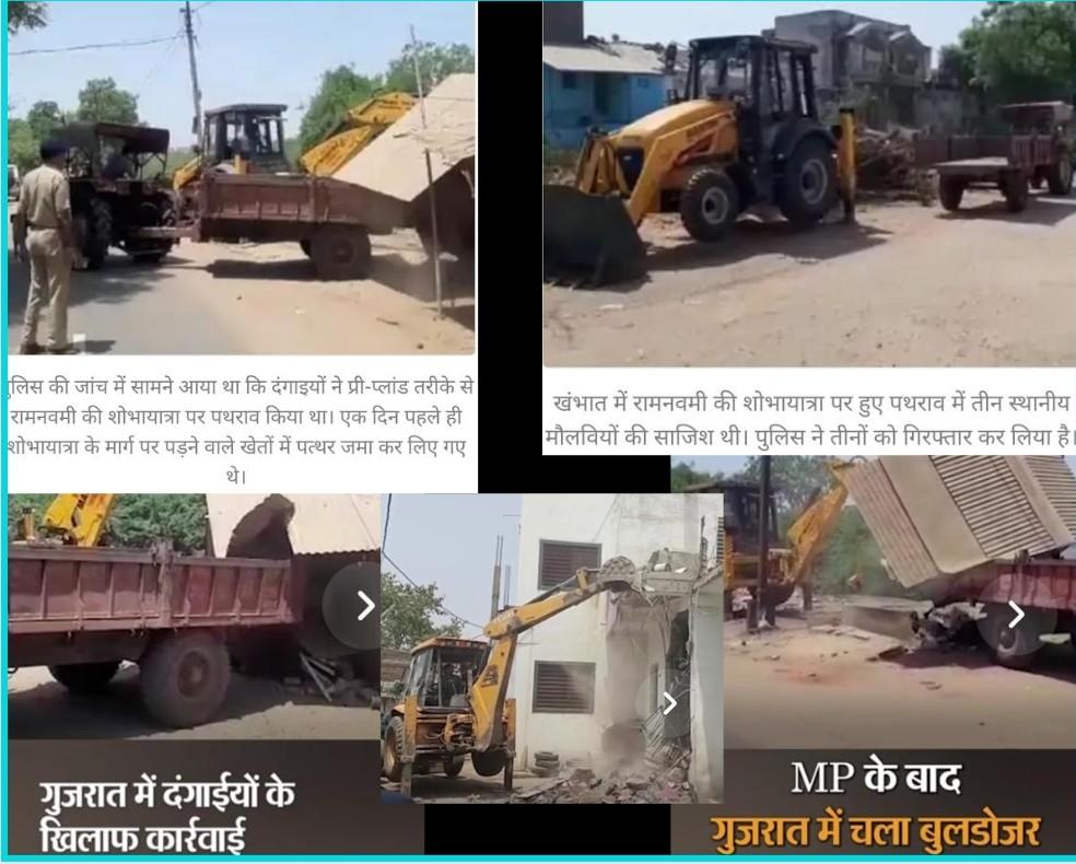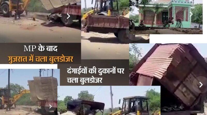 खंभात15 अप्रैल।उत्तर प्रदेश के योगी बाबा के बुलडोजर एक्शन की लोकप्रियता मध्यप्रदेश होते हुए गुजरात पहुंच गई है। गुजरात के खंभात में रामनवमी की शोभायात्रा पर पथराव करने वालों की दुकानों को प्रशासन ने बुलडोजर से गिरा दिया है। यह दुकानें हिंसा वाली जगह एक मजार (दरगाह) के सामने अवैध तरीके से बनाईं गई थीं।