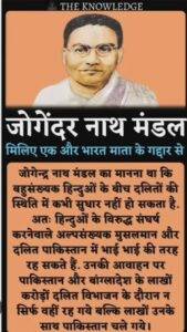 1947 में आज के बांग्लादेश क्षेत्र के लाखों सवर्ण हिन्दू भारत में आकर बस गए। जबकि मण्डल का कहना मानकर लाखों दलित हिन्दू मुस्लिम एकता के नारे का समर्थन करते हुए पूर्वी पाकिस्तान (आज का बांग्लादेश) में ही बस गए। विभाजन के बाद मुस्लिम लीग ने दलित-मुस्लिम गठजोड़ का मान रखते हुए मंडल को पाकिस्तान का पहला कानून मंत्री बनाया था। वे पाकिस्तान के संविधान लिखने वाली कमेटी के अध्यक्ष भी रहे थे। जोगेंद्र नाथ मंडल ने वैसे ही पाकिस्तान का संविधान रचा है जैसे बाबा साहेब ने भारत का संविधान।