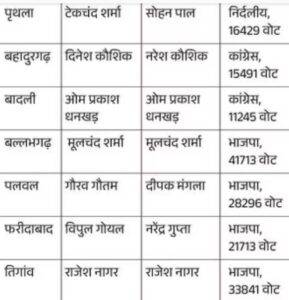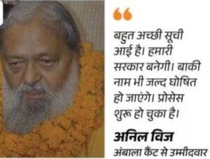 7- पार्टी ने कई दिग्गजों पर एक बार फिर भरोसा जताया है। विधानसभा अध्यक्ष ज्ञानचंद गुप्ता पंचकूला से एक बार फिर चुनाव लड़ेंगे। पूर्व गृह एवं स्वास्थ्य मंत्री अनिल विज अंबाला कैंट से ताल ठोंकेगे। हालांकि बीच में विज नाराज चल रहे थे। माना जा रहा है कि पार्टी ने उन्हें साधने की कोशिश की है।