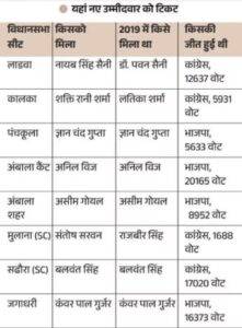 भाजपा ने नौ मौजूदा विधायकों का टिकट काट दिया है। 25 नए चेहरे को मौका दिया है। वहीं दो विधायकों की सीट बदली गई है। डिप्टी स्पीकर रणबीर गंगवा को नलवा की जगह बरवाला और कोसली के विधायक लक्ष्मण यादव को रेवाड़ी से चुनाव में उतारा गया है।