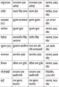8- शिक्षा मंत्री कंवर पाल गुर्जर को यमुनानगर की जगाधरी सीट से एक बार फिर टिकट मिला है। मंत्री कमलेश ढांडा कलायत से चुनाव मैदान में होंगी। पिछला विधानसभा चुनाव हारने वाले पूर्व वित्त मंत्री कैप्टन अभिमन्यु पर पार्टी का भरोसा बरकरार है। नारनौंद सीट से वे चुनाव लड़ेंगे।