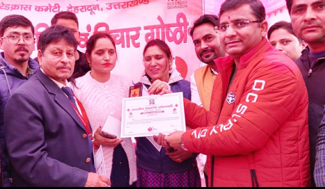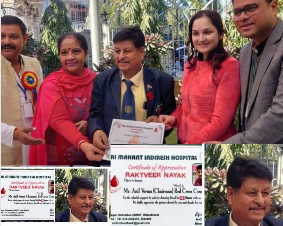 शिविर में महन्त इंदिरेश हाॅस्पिटल ब्लड बैंक की चिकित्साधिकारी डॉक्टर आशना गोयल ,सहयोगी बिपिन चंद , टेक्नीशियन टीम के किशन,कविता,ममता,दिव्या तथा विकास ने शिविर के कुशल संयोजन,संचालन तथा रक्तदान प्रेरणा सम्बोधन हेतु यूथ रेडक्रास के चेयरमैन अनिल वर्मा को “सर्टिफिकेट ऑफ एप्रीसिएशन” प्रदान कर सम्मानित किया ।