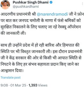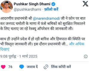 चमोली जिले में अचानक हुए हिमस्खलन के कारण 55 श्रमिक दब गए थे, जिनके बचाव के लिए तुरंत राहत कार्य शुरू किए गए थे। इस संकट की घड़ी में मुख्यमंत्री धामी ने चार घंटे के भीतर आपदा परिचालन केंद्र का दूसरा दौरा किया और स्थिति का जायजा लिया। उन्होंने वहां राहत कार्यों के बारे में पल-पल की जानकारी ली और राहत कार्यों को तेज करने के लिए आवश्यक निर्देश दिए।