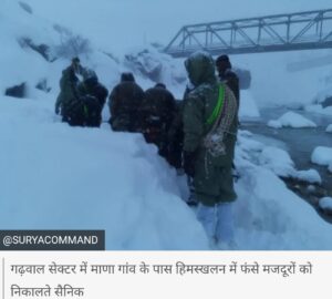 गढ़वाल सेक्टर में माणा गांव के पास हिमस्खलन में फंसे मजदूरों को निकालते सैनिक