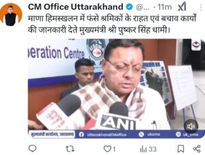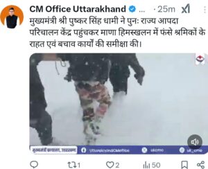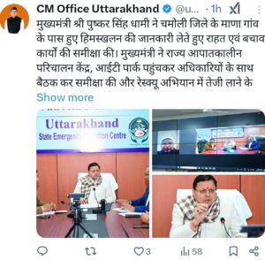 उत्तराखंड के मुख्य मंत्री पुष्कर सिंह धामी ने एक्स पर लिखा, “हिमस्खलन से कई मज़दूरों के दबने का दुःखद समाचार प्राप्त हुआ. आईटीबीपी, बीआरओ और अन्य दल राहत एवं बचाव में शामिल हैं. भगवान बदरी विशाल से सभी श्रमिक भाइयों के सुरक्षित होने की प्रार्थना करता हूं.”