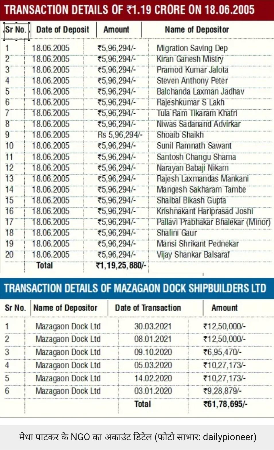 एक गैर सरकारी संगठन (NGO) है। नाम है- नर्मदा नवनिर्माण अभियान (NNA)। इसकी मुख्य ट्रस्टी हैं मेधा पाटकर। जी हाँ, वही स्वयंभू सामाजिक/पर्यावरण कार्यकर्ता मेधा पाटकर जो नर्मदा बचाओ आंदोलन (Narmada Bachao Andolan) की प्रवर्तक रहीं हैं।आपको यह जानकर ताज्जुब होगा कि इस एनजीओ के खाते में एक ही दिन 20 अलग-अलग खातों से एक समान रकम आई।