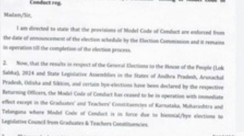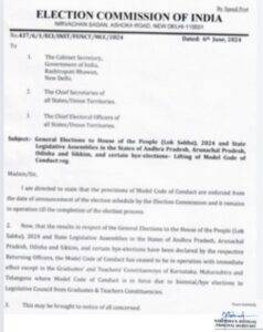 केंद्रीय कैबिनेट सचिव और राज्यों के मुख्य सचिवों को भेजे पत्र में चुनाव आयोग ने कहा कि लोकसभा चुनाव और अरुणाचल प्रदेश, सिक्किम, ओडिशा और आंध्र प्रदेश में विधानसभा चुनाव के नतीजे घोषित होने के बाद आचार संहिता हटा ली गई है।