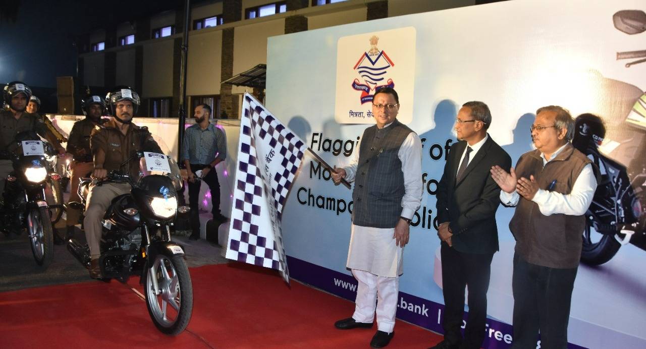 देहरादून 29 अक्टूबर। मुख्यमंत्री पुष्कर सिंह धामी ने शनिवार को मुख्यमंत्री कैम्प कार्यालय स्थित मुख्य सेवक सदन में उत्कर्ष स्मॉल फाइनेंस बैंक द्वारा उत्तराखण्ड में वित्तीय समावेशन तथा सीएसआर में की जा रही पहल कार्यक्रम में चम्पावत पुलिस को 10 मोटर साइकिलें हरी झंडी दिखाकर रवाना की। मुख्यमंत्री ने बैंक की चम्पावत शाखा का वर्चुअली लोकार्पण करने के साथ ही विभिन्न स्वयं सहायता समूहों को संयुक्त आजीविका ऋण के चेक भी वितरित किये।